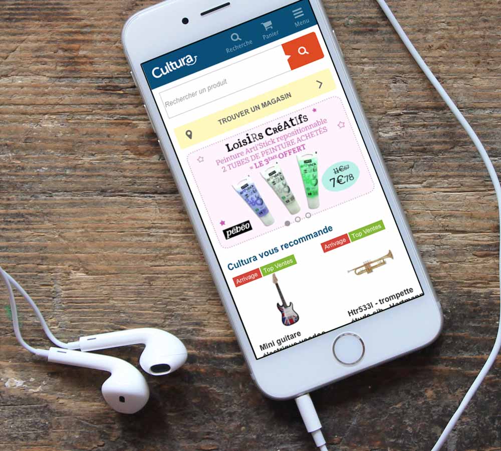 CulturaIntégration du site eCommerce Cultura en version Mobile, pour le compte de la société d'ingénierie spécialiste du eCommerce avec Magento X2i.Front-EndresponsiveMagento